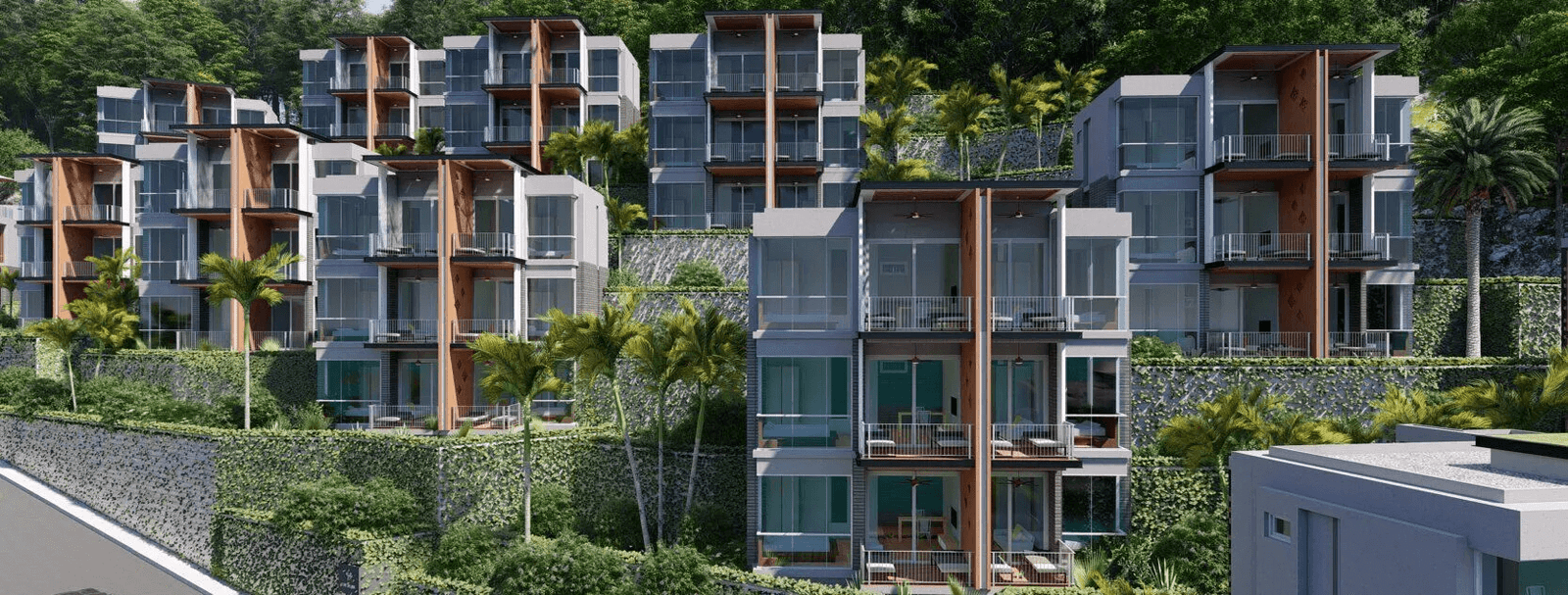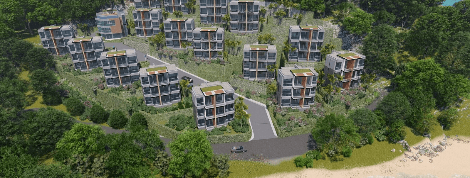 Проект спроектирован с акцентом на вид и приватность: большинство юнитов имеют панорамные окна и балконы, ориентированные на море или на внутреннюю территорию с бассейном. Интерьеры выполнены в современном тропическом стиле: светлые тона, натуральные материалы, большие раздвижные окна и открытые планировки. На территории — клуб-хаус, infinity-бассейн с видом на море, фитнес-зал, ресторан/кафе, зоны отдыха и барбекю, охрана и парковка.