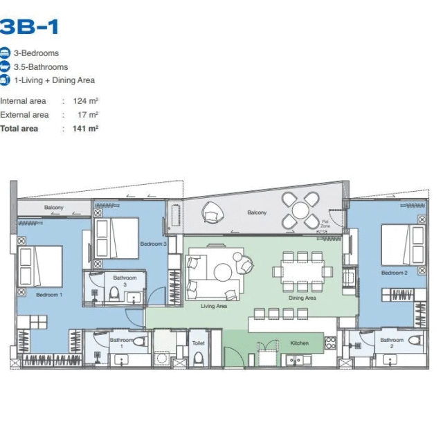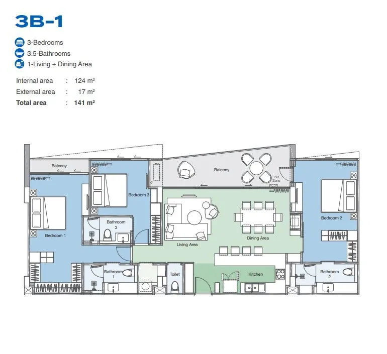 Дополнительно предлагаются финансовые планы на 1, 3 или 5 лет с процентной ставкой около 3–7% годовых (через девелопера / партнёрские финансовые схемы). Конкретные условия зависят от юнита и времени покупки — фиксируются в коммерческом предложении.