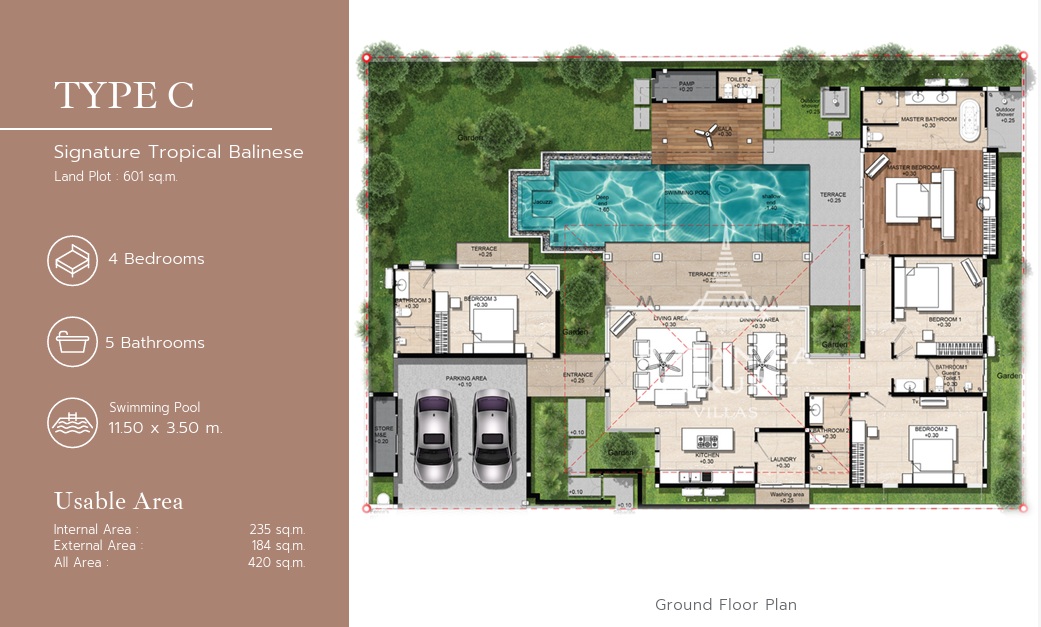 Каждая вилла — это 4 спальни, открытая планировка зоны гостиной/столовой/кухни, частный бассейн и ландшафтный сад. Концепция ориентирована как на постоянное проживание, так и на долгосрочные инвестиции: планировки продуманы под семейный формат, а локация обеспечивает быстрый доступ к пляжам, школам, торговым центрам и аэропорту.