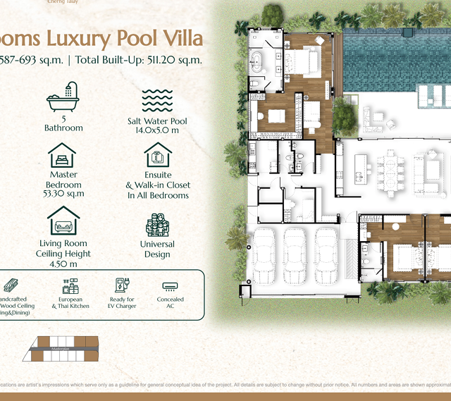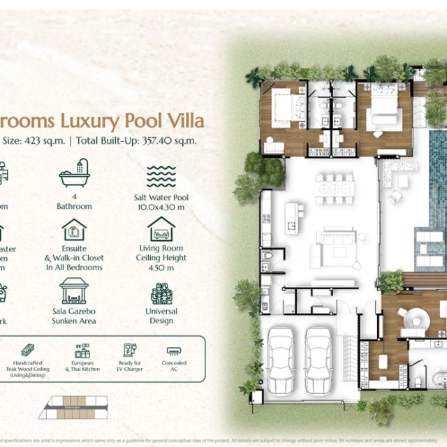 Комплекс включает всего 13 вилл — 3- и 4-спальных, с площадями от ~357 до ~511 м² и участками от ~423 до ~693 м². Высокие потолки в гостиных (до 4,5 м), большие панорамные окна, продуманные наружные зоны и солёные бассейны формируют ощущение современного тропического дома, заточенного под семейный комфорт и приватность.