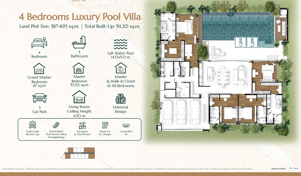 Это вариант для тех, кто хочет жить в пешей или очень близкой доступности от инфраструктуры Bang Tao, но при этом в отдельной вилле, а не в кондоминиуме. Формат 3–4 спальни с приватным бассейном, высокими потолками (до 4,5 м), продуманной планировкой и «универсальным доступом» (подходит для разных возрастов) делает проект удобным для семейного проживания на постоянной основе или в формате «второго дома».
