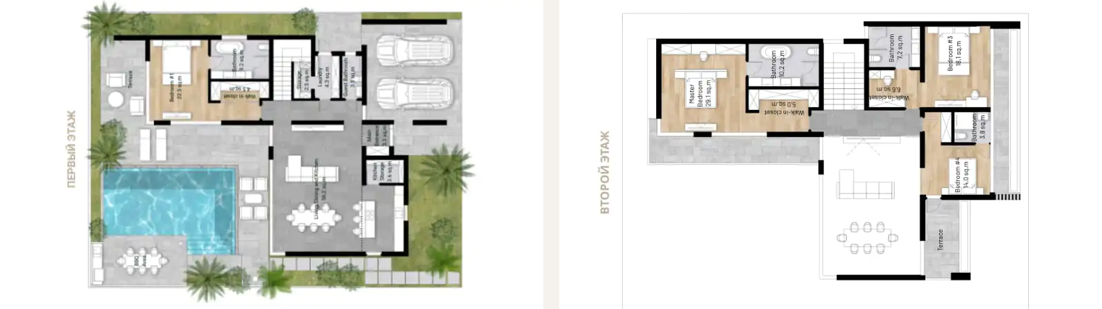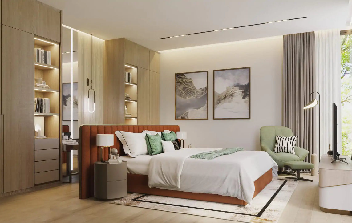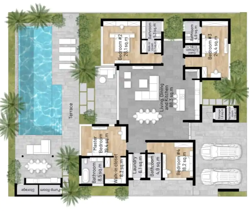 Всего предусмотрено 27 вилл разных типов (A/B/C) с 3–4 спальнями и 4–5 санузлами. Виллы имеют просторные участки (примерно 400–689 м²) и площади домов от ~326 до ~512 м²: с открытыми планировками, кухнями премиум-класса, мастер-сьютами, лаунж-зонами и возможностью выделить кабинет или спортзал. Концепция — современная архитектура в сочетании с природой: большие окна, вид на озеро и холмы, натуральные материалы и много зелени.