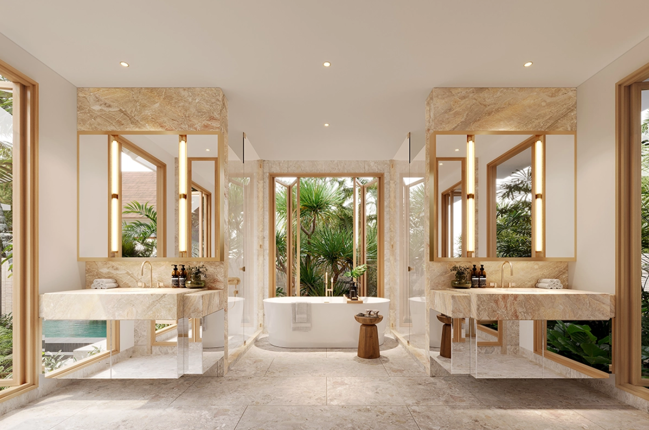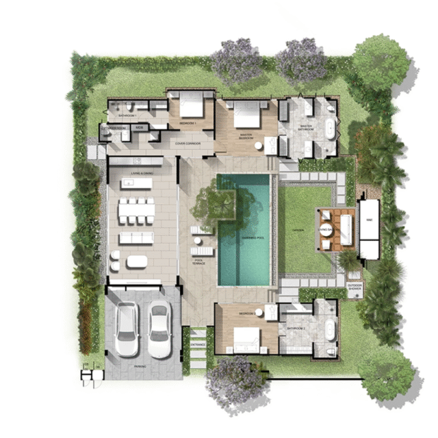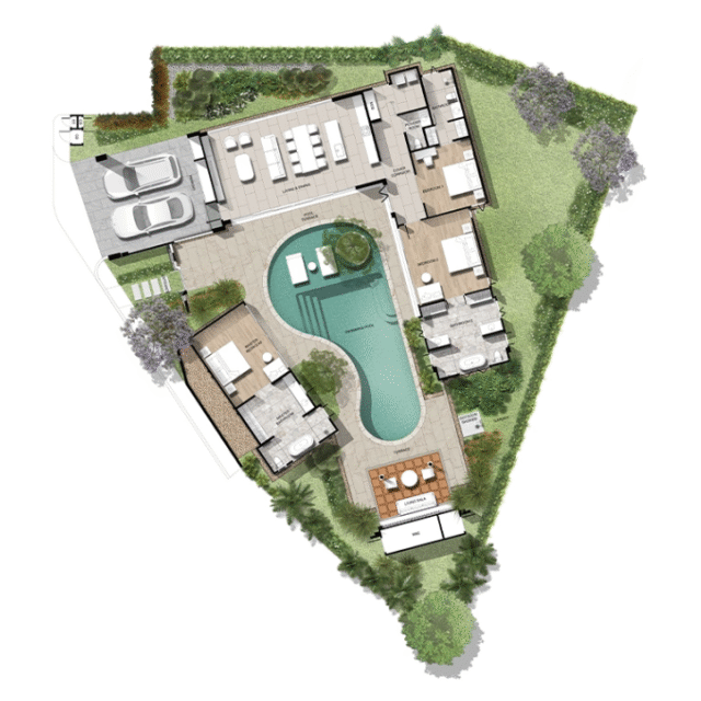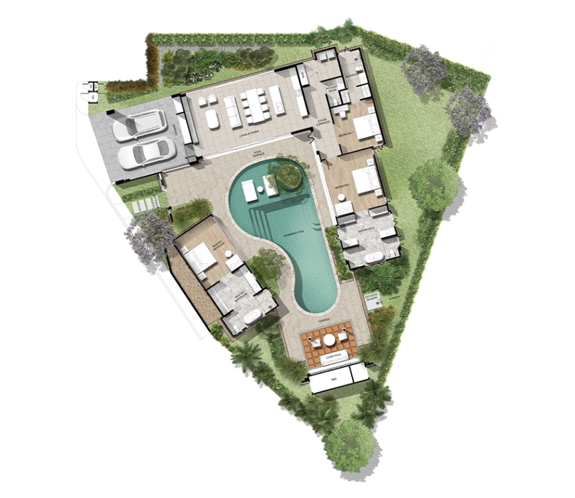 Каждая вилла — это 3 спальни, 4 санузла, гостиная с выходом к бассейну, кухня, павильон и паркинг на 2 автомобиля. Архитектура ориентирована на открытое пространство и интеграцию с природой: внутренние зоны плавно переходят в сад и к бассейну, создавая атмосферу современного тропического дома