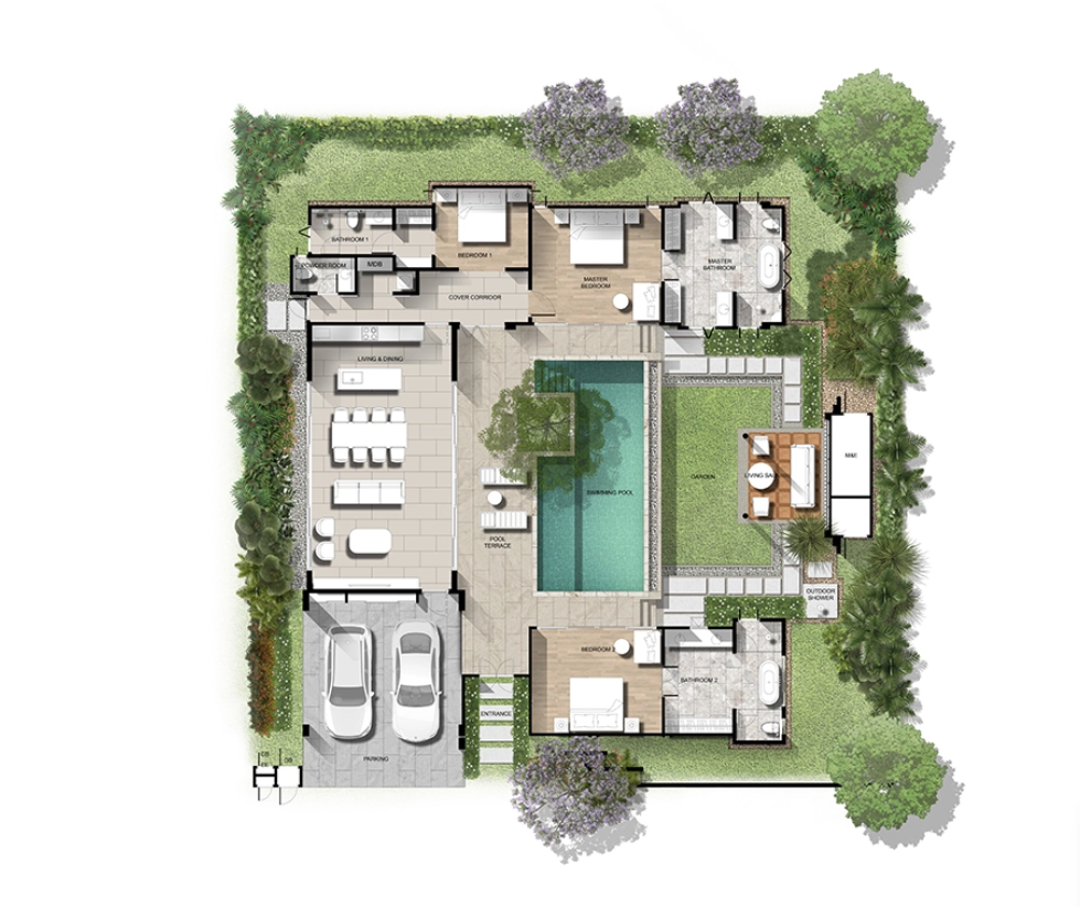 Проект выполнен в стиле современного тайского курортного дизайна: просторные планировки, большие окна, террасы, зелёные участки от 532 до 840 м² и закрытая охраняемая территория.